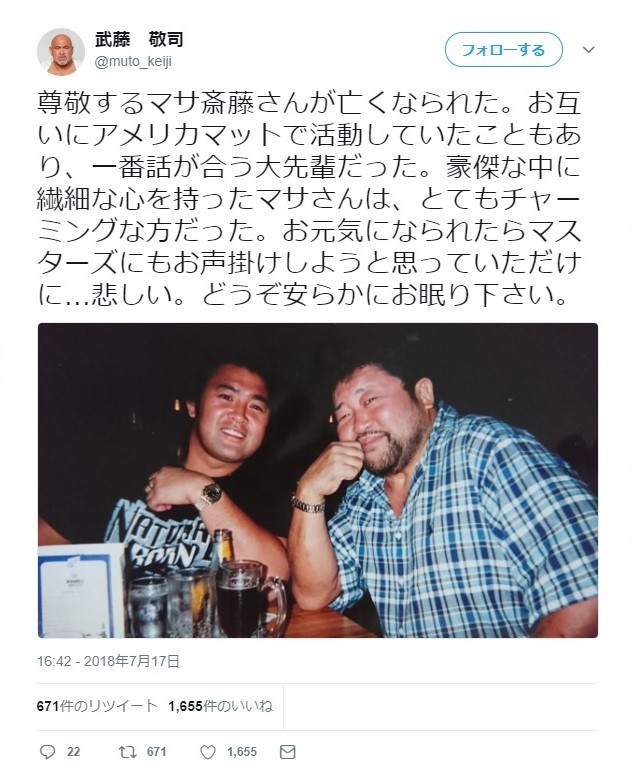 武藤 敬司 尊敬するマサ斎藤 さんが亡くなられた お互いにアメリカマットで活動していたこともあり 一番話が合う大先輩だった 豪傑な中に繊細な心を持ったマサさんは とてもチャーミングな方だった お元気になられたらマスターズにもお声掛けしようと